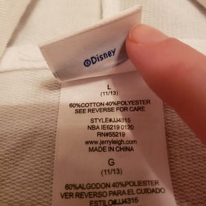 Hoodie is a women's size large, but does fit like a medium. Hoodie is new with tags and has a foil design of Minnie Mouse on left side of Hoodie and foil writing of Minnie Mouse down the left arm. Perfect for any Minnie Mouse or Disney fan.