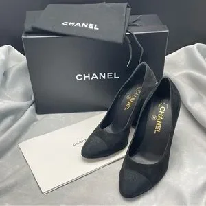 These black suede pumps feature tonal grosgrain cap toe and 4.25" block heel. CC logo on cap toe. Faux Pearl embellishment on the heel. Padded leather insole and leather sole. Made in Italy. These authentic Chanel pumps come with the original box + dust bags.