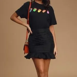 Chic woven fabric shapes this stylish high-waisted skirt with ruched detailing throughout. Form-fitting bodycon skirt flares to a ruffled, mini hem. Pair with a sexy bodysuit and your favorite booties for an OOTN! Hidden zipper/clasp.