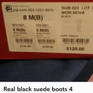 JCPenney Black suede size 9 medium black suede knee-high boots 4 inch heel please see photos from description of boot. Brand new an original box never worn this is a JCPenney's item.