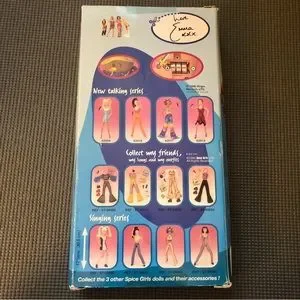 New in box vintage 1999 Spice Girls Baby Spice doll with blue dress, platform shoes, and microphone. Never opened. There is some damage to the box, as pictured. She does not talk anymore, but I suspect Sh could with a new battery. Smoke free and pet friendly home!