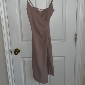 Sexy nude body con dress with wrap over front, left leg slit, asymmetrical shape, and adjustable straps.