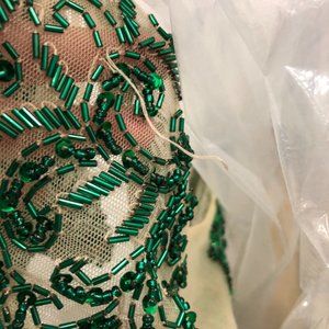 New w/ tags, but tried on as a sample. Good shape, see pics for details (may need extra hook & eye, few loose beads and loose threads, few snags on fabric). Good sample condition but not perfect. The quality of these gowns are heads & shoulders above anything you can buy at the mall!