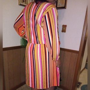 A sheath dress in bold stripes with a figure-flattering faux-wrap neckline.