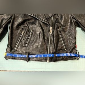 Levi’s black croc faux leather moto jacket with removable belt. Size small. Crocodile textured pattern throughout entire jacket. Lined. Black with silver hardware. Three zippered pockets: two normal sized pockets and one small one. Zippers on sleeves. Snaps to keep lapels down. New with tags. Never worn