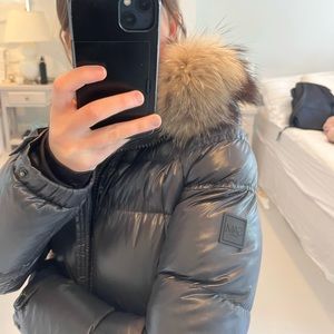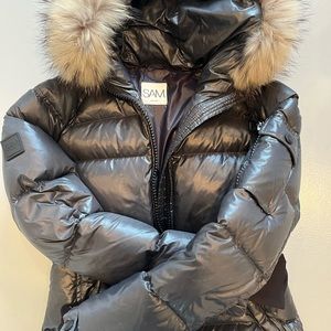 The jacket features a fur trimmed hood, center front zip closure, 2 lower zip pockets, and spandex wrist cuffs with thumbholes.