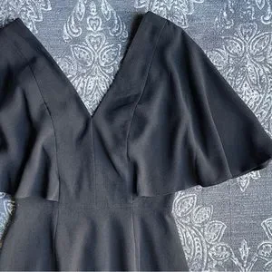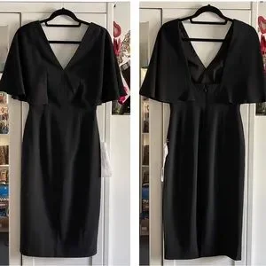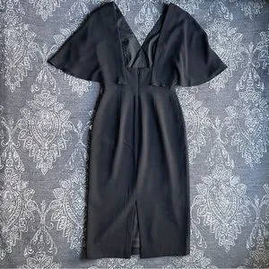 New without tag, just wrinkled from storage. Labeled Size Small. Color: Black. This cocktail attire ready dress in Black features a deep v-neck and (even deeper square back) with a pencil skirt and butterfly sleeves.