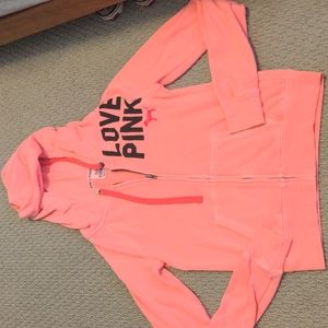 2. neon pink zip up hoodie. this is an older piece, has some pilling.
