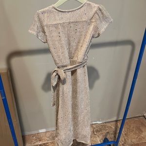 Only worn for about 30 minutes to take family pictures in.color is champagne with sparkles.