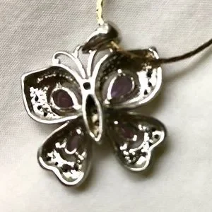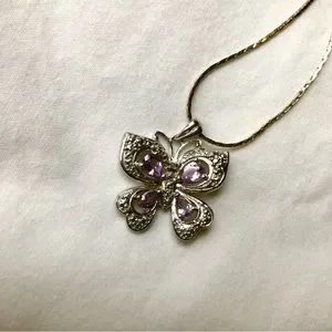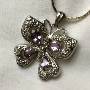 This is a very pretty sterling silver butterfly pendant with pear shaped amethyst in its wings. It is presently on a 9kt gold, or gold filled 16in chain. It was the best birthday she ever had, her love of butterflies was reflected in the jewelry she had been gifted.