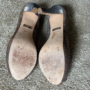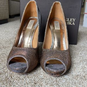 Beautiful sparkly Badgley Mischka platform heels! These can be gold, silver, and pewter depending on the light. Worn once - please see photos for soles and some damage to the fabric on the heels. The photos actually make the heels look more damaged than they are. Heel height is approximately five inches.