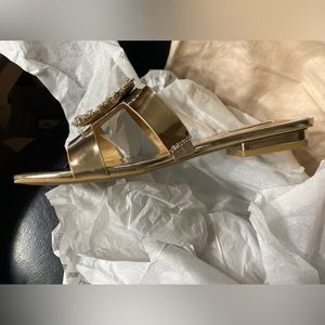 Clusters of crystals embellish the brooch at the straps of a stunning slide.