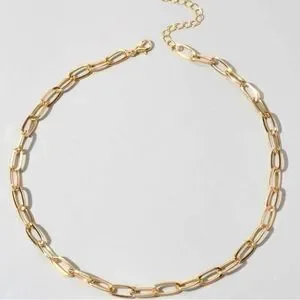Gold alloy chain link choker necklace. Length is 16” with 2-3/4” extension and lobster clasp closure. Very simple yet elegant look. Charms or pendant can be added as well.