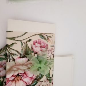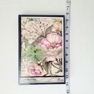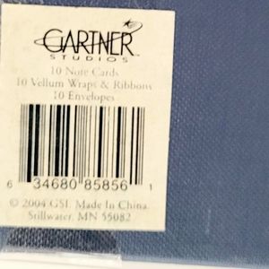 10 note cards with Vellum wraps. Gartner Studios. Includes 10 note cards, 10 vallum wraps/ribbons and 10 envelopes. Plastic cover has scratches on it.