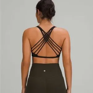 Lululemon Free to be Wild bra in a heathered dark grey. Last 2 photos illustrate the fit of the bra only. Size 6. Excellent condition.
