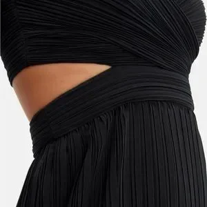 Sleeveless pleated dress with sweetheart neckline, crisscross bust, edgy cutouts at waist and layered skirt.