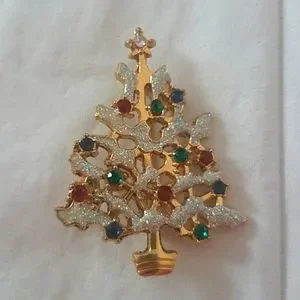 Vintage goldtone tree with green, red, and blue rhinestones. About 2 inches high and 1.5 inches across. Clasp on the pin stays closed.