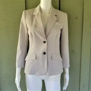 It's lined, has shoulder pads, 3 front pockets and fastens with 2 front buttons. It has bracelet length sleeves.