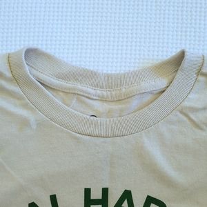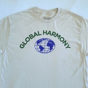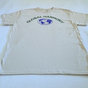 Color of tee👕 is a light tan with "Global Harmony" on front in hunter green💚 and a graphic of the earth🌎 in cobalt blue💙