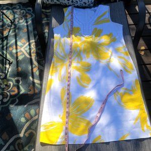 Beautiful, sunny dress from Sandra Darren, very good condition. Beaded neckline. White and sunny yellow floral pattern. Unlined, easy care 97% cotton, 3% spandex.