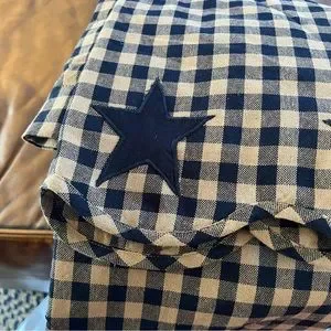 Never used 2 full sets. One set is opened but not undone. So cute and charming Navy Star Scalloped full length curtains. Will add such charm to any primitive decor!