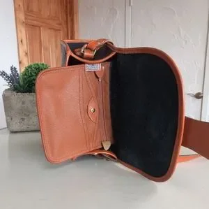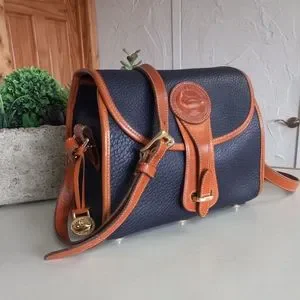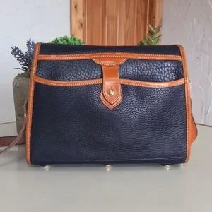 Dooney & Bourke DBB317 Midnight Blue, Essex Collection. Crossbody style, AWL, Pebbled Leather. Minor touch ups to the Navy Blue Leather. 3 areas. The trim has patina into a honey color as it was designed to over time. The inside is pristine clean, navy blue suede. This bag has great form. The outside has a full width slip pocket on the back. I professionally cleaned, touched up 3 scratched areas, leather conditioned, and polished the brass to shine like it did when it was new 30+ years ago. This bag is versatile, you can use it year round. It fits all your necessities plus much more!!