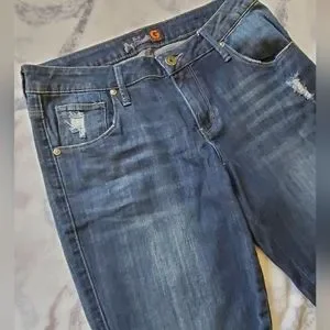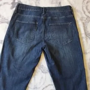 Slight rip and fade design dark blue denim jeans by Guess. Size 26 with 26" inseam. Button fly.