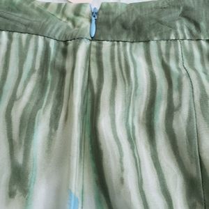 Knee length, pleated silk skirt. Hidden zippered closure. Green, blue, white.