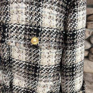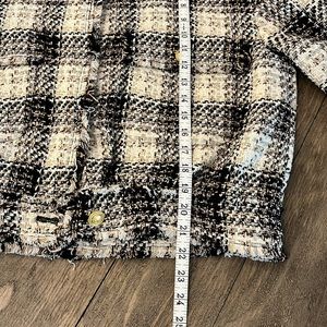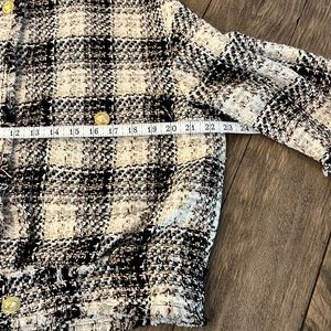 Zara black and off white tweed jacket. Slightly oversized, bomber style with pockets and gold button close. Cuffed 3/4” sleeves with button detail. Fully lined. Heavy weight. Frayed edge detail. Worn once. Great condition.
