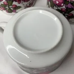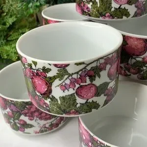 Beautiful vintage set of 6 green, plum & pink porcelain Enesco Japan soup mugs with fruits (figs, gooseberries, pears, plums, & currants). Mugs are 4 1/4” diameter x 3” tall and hold 16oz liquid. Microwave and dishwasher safe. Mugs are in excellent condition. No chips or cracks noted. There are some slight variations, in the colors, but they are the same. Super pretty mugs. Thanks for looking! 😊