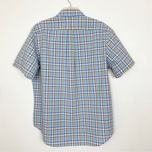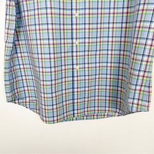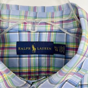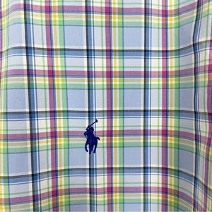 Mens Ralph Lauren Plaid button down shirt. Blue, red, green, yellow and white. Woven cotton. Full button closure. Embroidered Polo logo on left side of chest. 100% cotton.