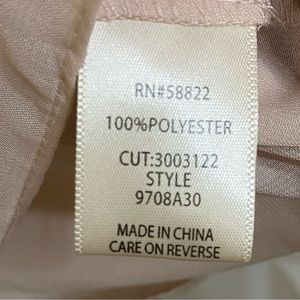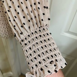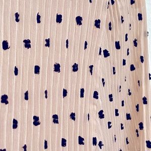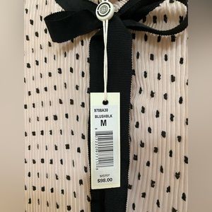 Lovely, feminine, blush and black Max Studio blouse. Close pleats soften and give way to a relaxed profile. Looks beautiful tucked in, or left loose. The sleeves are shirted at the base to form a cuffed look. Gross grain ribbon holds the high collar closed.