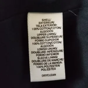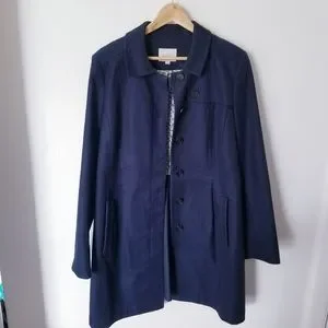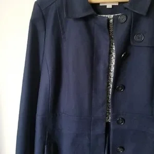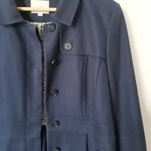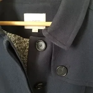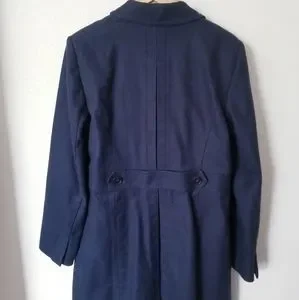 This coat feels of high quality, a good weighted coat. The texture on the cotton gives it an elevated look. Navy blue in color. Worn for a single winter trip. Excellent used condition. Only a little yellowing inside (underarm), last two photos, a light color difference so the camera could barely pick it up.