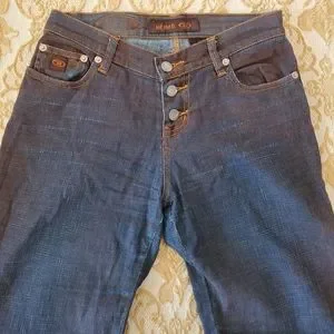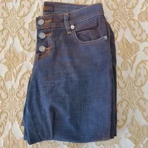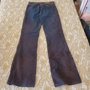 Beautiful suede jeans in mint condition. A mixture of the colors blue and maroon throughout the pants. No zipper. Three buttons for closure. I also have the matching jacket. Let me know if you would like to see it.