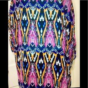A Soft stylish kimono from SIMPLICITY, in a beautiful Free Form,a bit Oversized flattering shape! Colorful Patterns in Turquoise, Pinks, Royal Blue, Black & a light gold-fishy orange with a touch of white mixed in.
