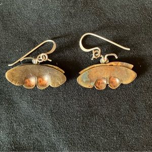 Handmade butterfly earrings, multi-tone metal design measures 1" wide x 0.75" tall. Made of three tones of metal, the under wings are copper, the top wing is bronze and the body is silver-tone. The details are stamped into the metal. Delicate design, these hang closer to the ear. Good shape, barely worn.