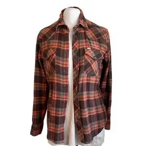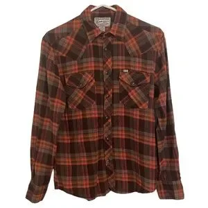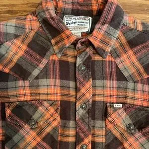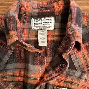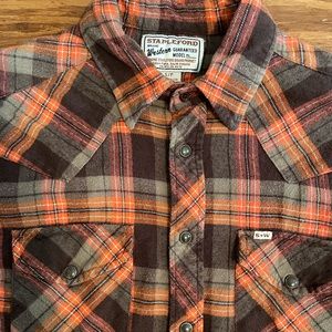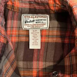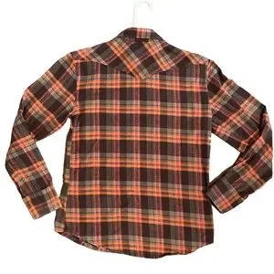 Vintage Stapleford Brand Western Plaid Flannel shirt Size S/P. Snap up longsleeve shirt with snap down pockets. The Orange & Brown warm tones 100% Cotton. Smoke Free. Same Day Shipping.