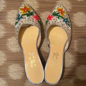 Adorable vintage slides with a micro wedge in a size 8. Made of leather with hand embellished beading and sequins. Great condition- appear brand new other than some wear to the leather soles.