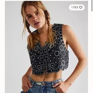 Add the loveliest layer to any look with this vintage-inspired vest featured in a cropped, open-front silhouette with stunning embellishments throughout and scalloped hems for an added special touch.