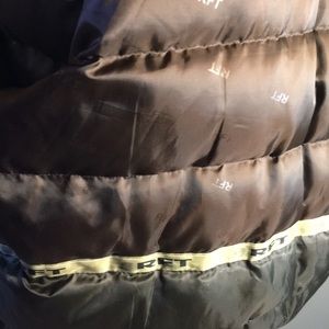 RFT by Rainforest light brown bomber jacket. Down filled. Brown collar trim. Beautiful quality micro suede. Double side pockets, zip closures. Two inner pockets. ***There is hand written marking on lining on label and interior waistline by previous owner, pictured. It is not visible when worn, but be advised it is present. And small dot on interior chest lining. Also pictured.****