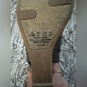 Gray woven wedge with 3.5 inch heel with 1 inch platform. Zip closure. Minimal wear. Excellent condition.