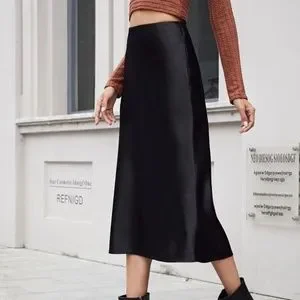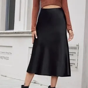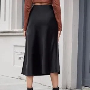 Luxe Black Zipper Satin Midi Slip Skirt