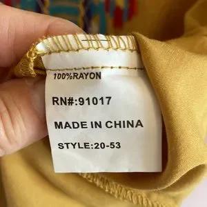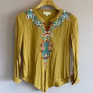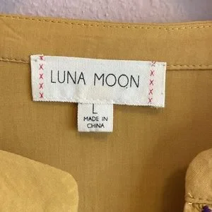 Luna Moon mustard colored tunic with fun embroidery on front.