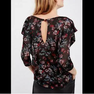 FREE PEOPLE BLACK FLORAL PRINT RUFFLE ACCENTS DOCK STREET TOP