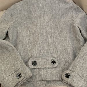 High collared grey jacket. No tags however appears to be a small or medium. I think it’s wool with a synthetic lining.