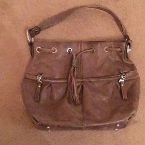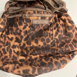 Brown leather handbag with leopard lining. Drawstring closure with great pockets for all essentials. Great condition.