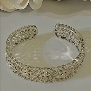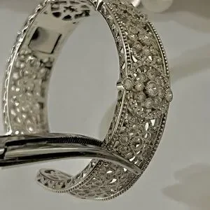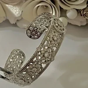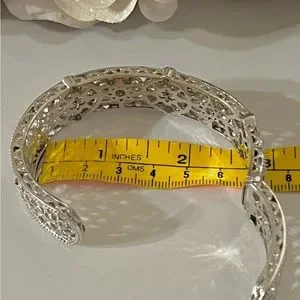 Gorgeous large cuff bracelet in a floral motif. Reminiscent of the Art Deco era with the detail and balance of the peace. A true heirloom estate Pierce. Excellent used condition like new. Hallmarked Judith Ripka, 925, Thailand.