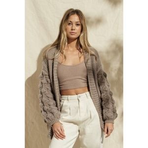 SOLD OUT Khaki Pompom Sleeve Knit Open Cardigan Sweater