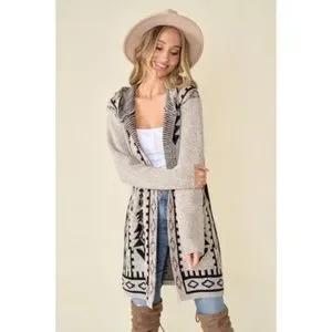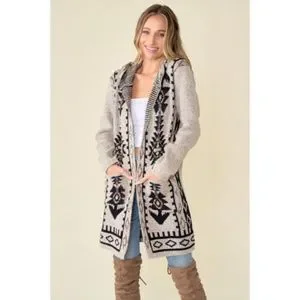 Sweater long sleeve Hooded open long cardigan with Aztec Rainbow Jacquard Pattern.