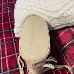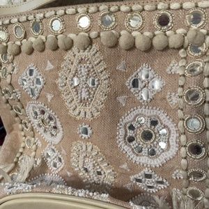 Shoulder Bag Beige&White Canvas trimmed in pearl-beads, silver reflecting trim